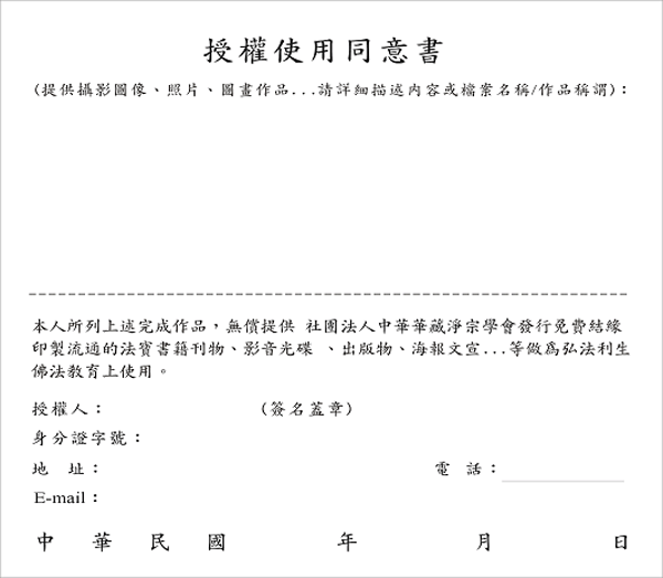 * 附註說明:以上種類可用直接郵寄或燒錄製成光碟片,並附上授權使用同意書(如附件);下載列印填具提供照片項目內容、簽名蓋章後郵寄:社團法人中華華藏淨宗學會